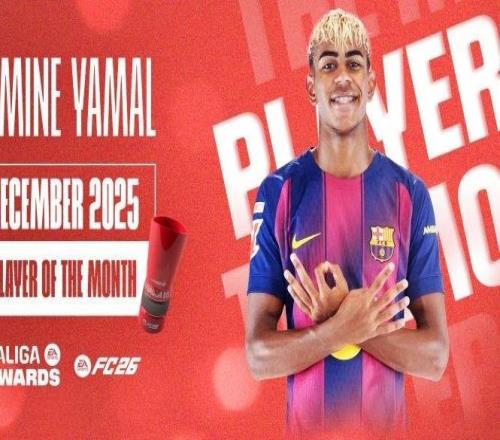官方:巴萨前锋亚马尔当选西甲12月最佳球员