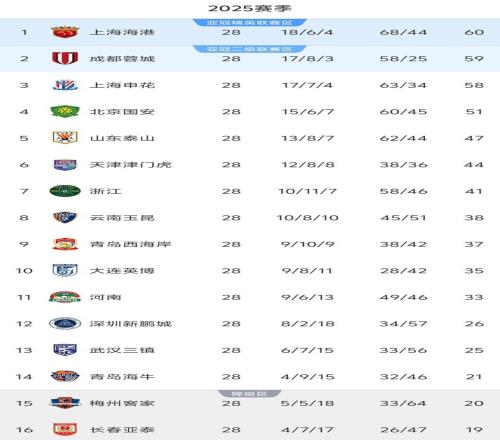 28轮过后的积分榜,成都蓉城、申花在上港先输球的情况下未能把握住机会,前3的排名没有发生变化,上港积60分仍旧领跑,成都蓉城以1分之差继续排在第2,申花同样以1分之差位列第3。尽管排名没有发生变化,但3支争冠球队的分差缩小到了2分,在联赛仅剩2轮的情况下他们都没有了容错空间,谁输球谁将退出争冠行列。