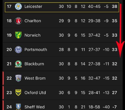 不过莱斯特城的积分已经与降级区的西布朗同分,只是凭借10个净胜球优势侥幸暂时摆脱降级区。