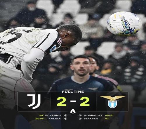 拉齐奥一度2-0领先,尤文在绝境中由麦肯尼和卡卢卢连追两球,补时完成2-2绝平。