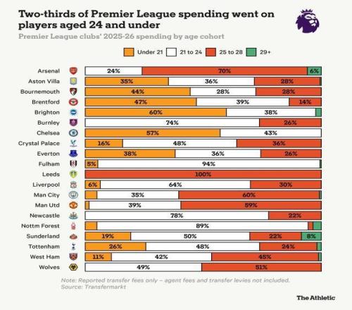 02月10报道 TA统计了20支英超球队本赛季在新援上花费的超过35亿英镑(47.5亿美元)之后,我们按俱乐部进行了细分,并将他们的支出划分为四个明确的年龄段:21岁以下、21至24岁、25至28岁,以及29岁及以上。从整体来看,49%的支出流向了21至24岁年龄段的球员,这是该年龄段连续第八个赛季占据转会费支出的最大份额。