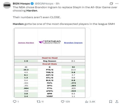 美媒BGN Hoops 写道,哈登居然没有被选为全明星,这简直是彻头彻尾的打劫,萧华选英格拉姆顶替库里参与全明星而不选哈登,这两人的表现根本不是一个等级的,哈登是这个联盟最不受尊重的球星之一,太无语了。