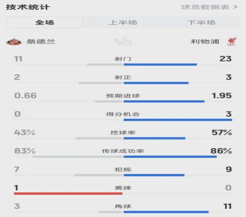 全场数据惨淡:控球率57%、射门23-11遥遥领先,但射正仅3次!预期进球(xG)1.95却只打入1球,甚至这唯一的进球还是范戴克头球反弹入网,带有极大的运气成分。