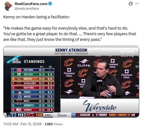 正如赛后骑士主帅阿特金森所说:“哈登让身边的每个人都打得更轻松,他给艾伦每一次传球的时机把握都非常精准,就连分球到外线的选择也恰到好处,你得是顶尖球员才能做到这一点,联盟里没几个人真正能做到。”