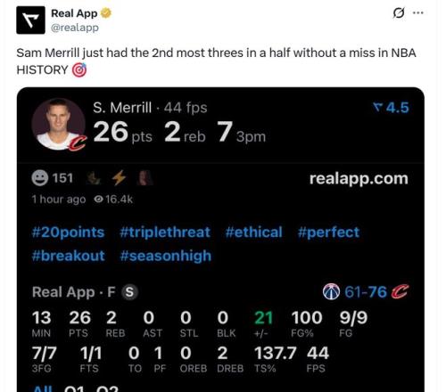 并且半场比赛梅里尔三分7中7也打破NBA历史纪录,并列NBA历史第二多,仅次于布伦森(8记)。
