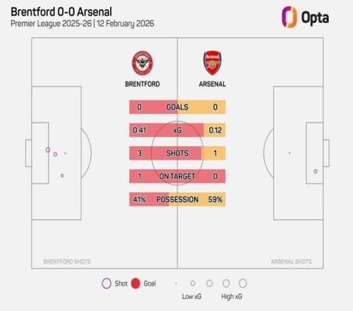 英超第26轮,布伦特福德主场对阵阿森纳,上半场战罢比分为0-0,上半场双方仅完成4次射门,为本赛季英超射门次数第二少的上半场。