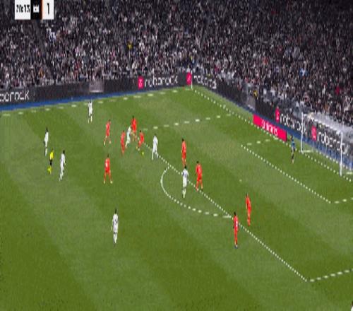 43' 维尼修斯连续变向,小角度打门被挡出底线。